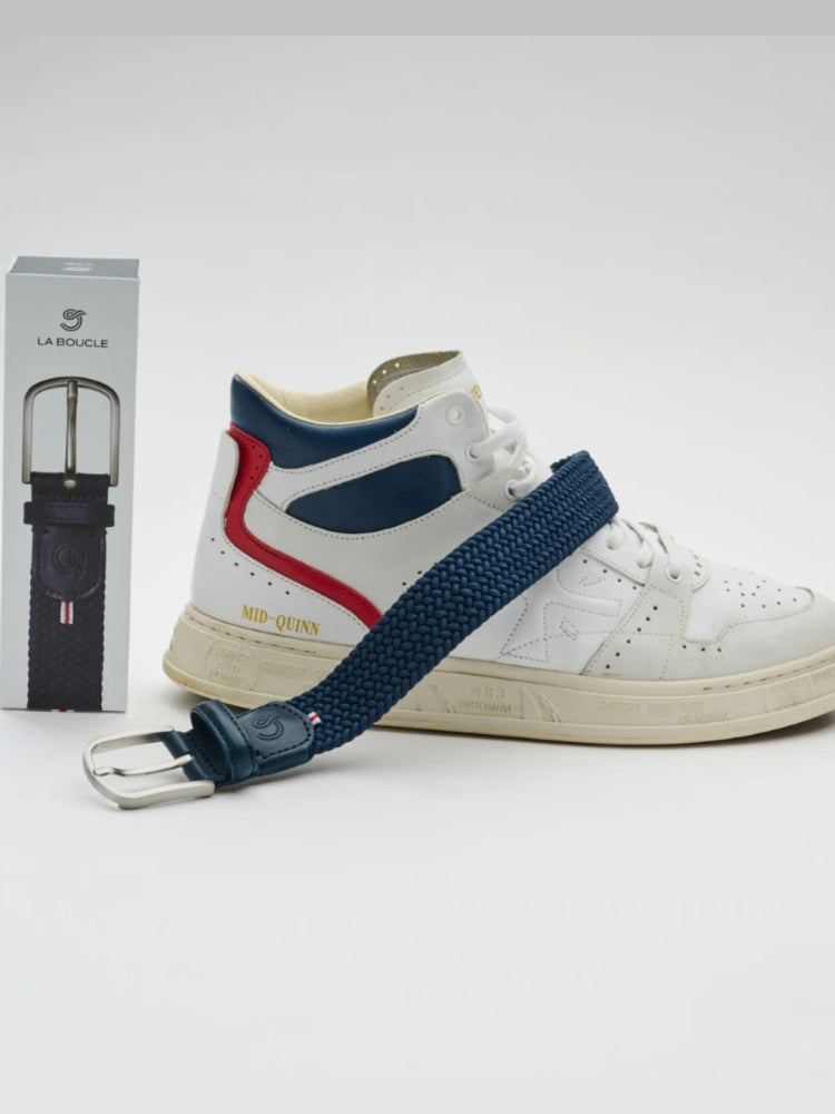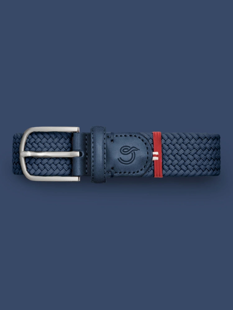 Cintura da uomo La Boucle, modello intrecciato elasticizzato senza fori, con dettagli in pregiata pelle navy