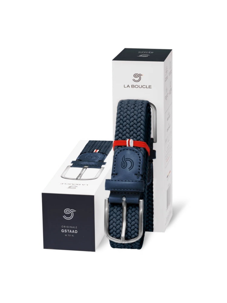 Cintura da uomo La Boucle, modello intrecciato elasticizzato senza fori, con dettagli in pregiata pelle colore navy