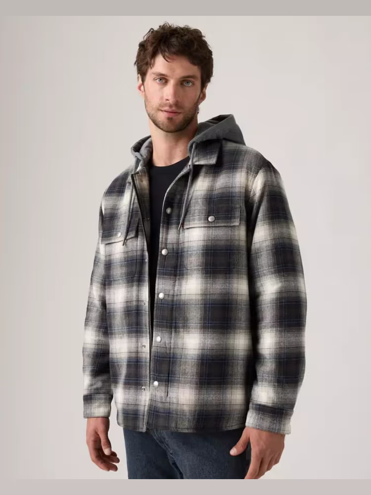Giacca da uomo Levi's con esterno in flanella stampa quadri e interno in sherpa 100% poliestere, modello caldo e confortevole grazie anche al pratico cappuccio