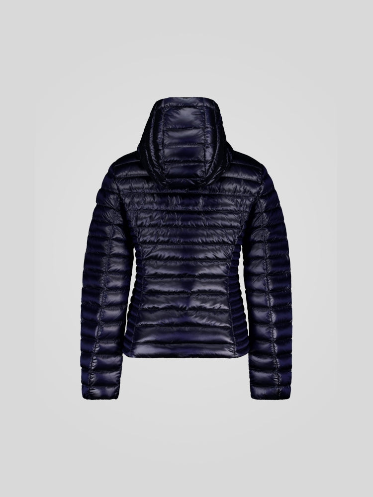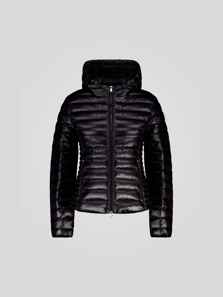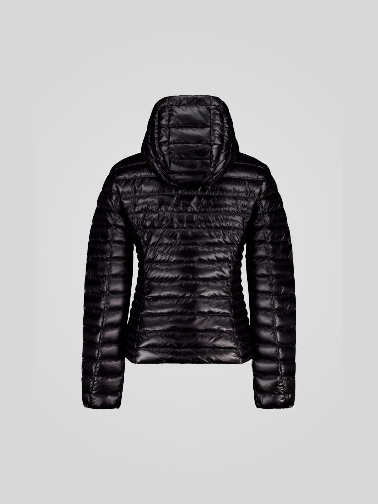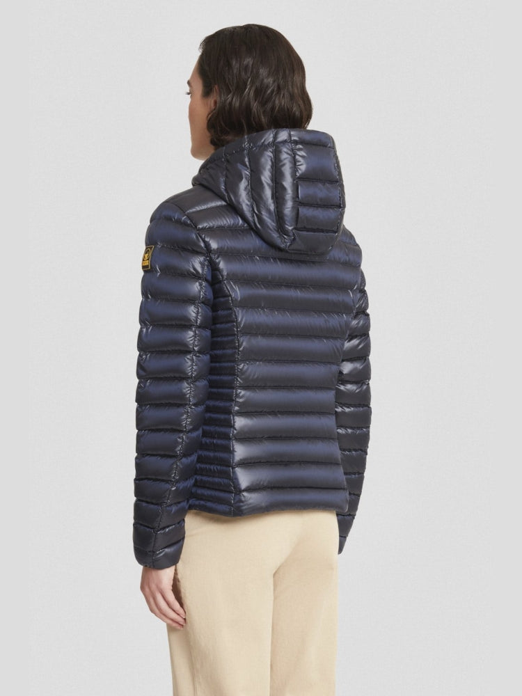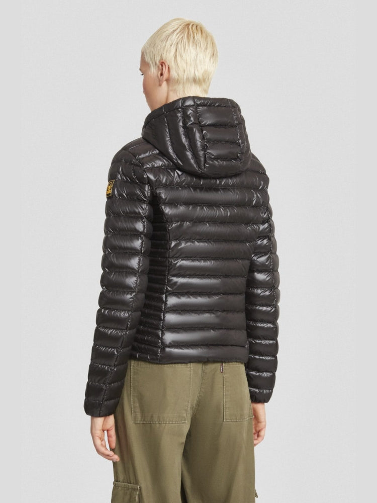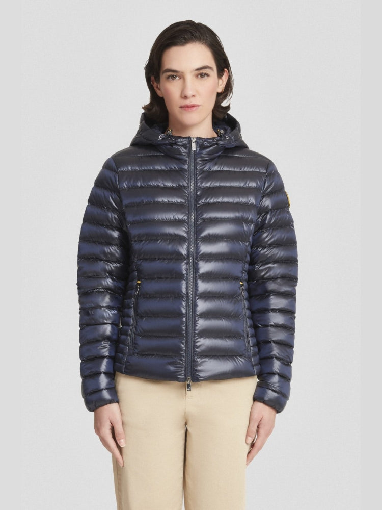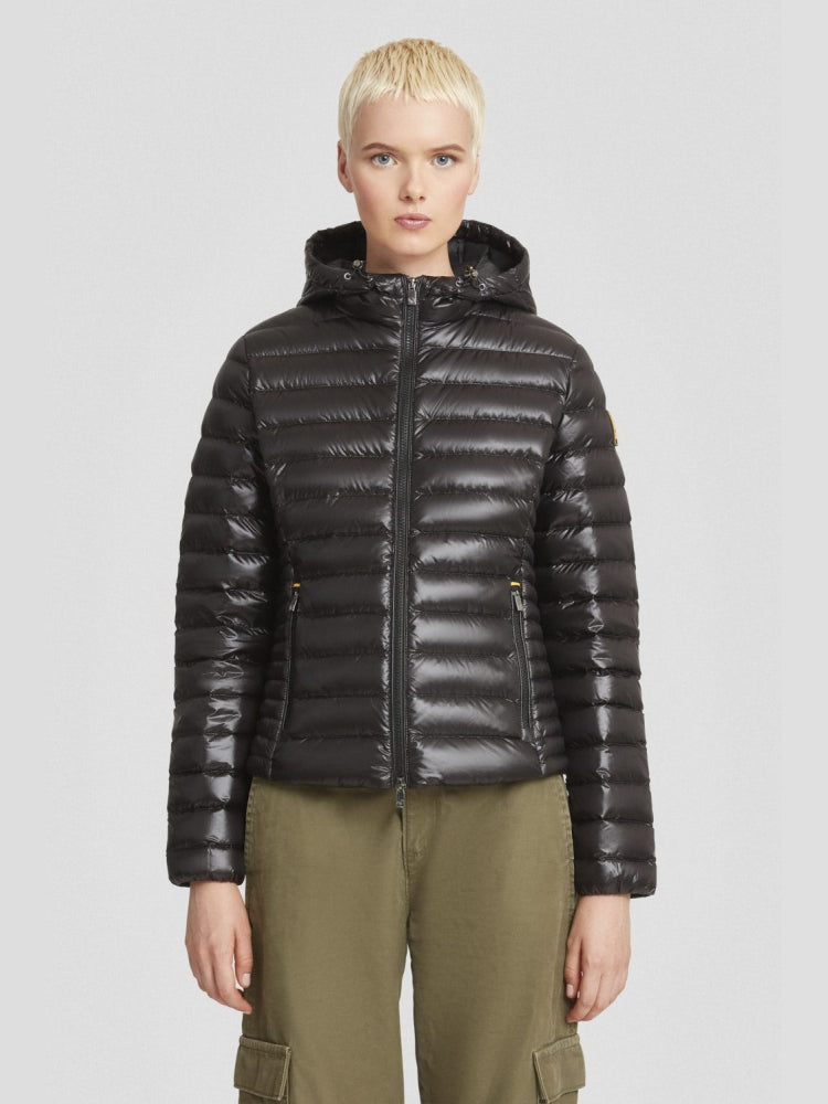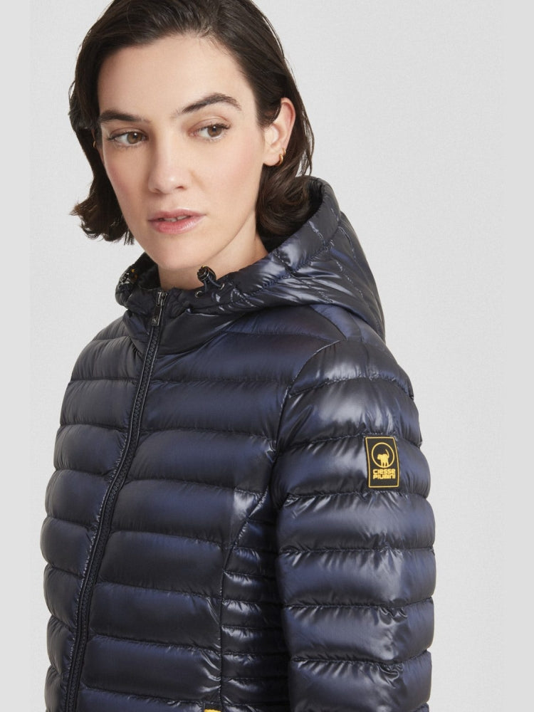 Giubbotto da donna Ciesse Piumini modello corto con cappuccio, con finitura lucida trapuntata. Imbottitura in piuma certificata 90/10, 800 Fill Power, che lo rende caldo, impermeabile, antivento ma leggero e facilmente comprimibile